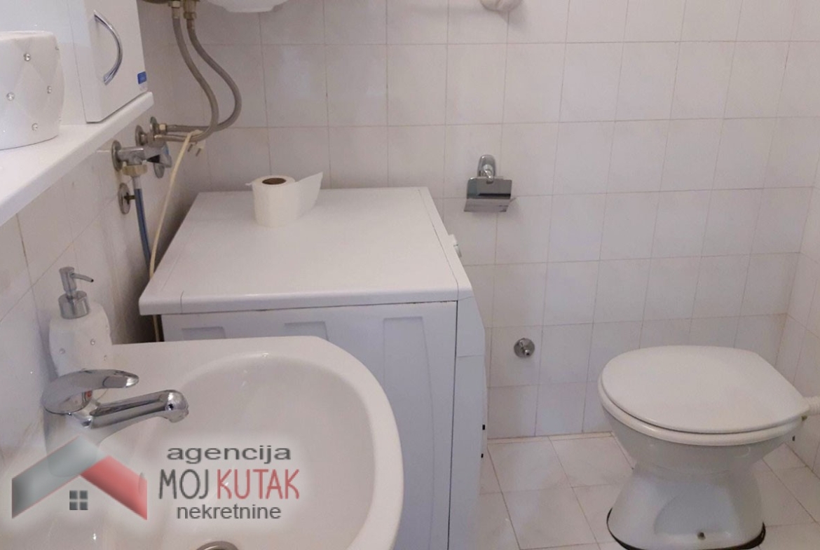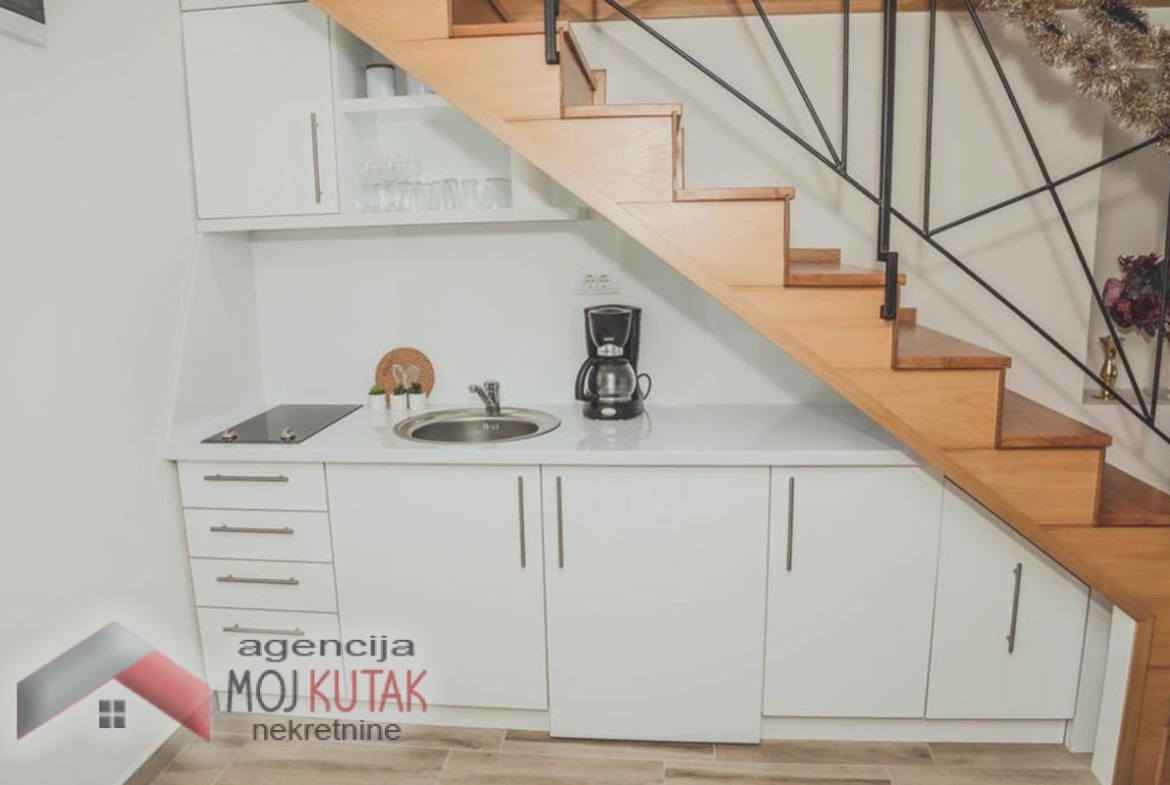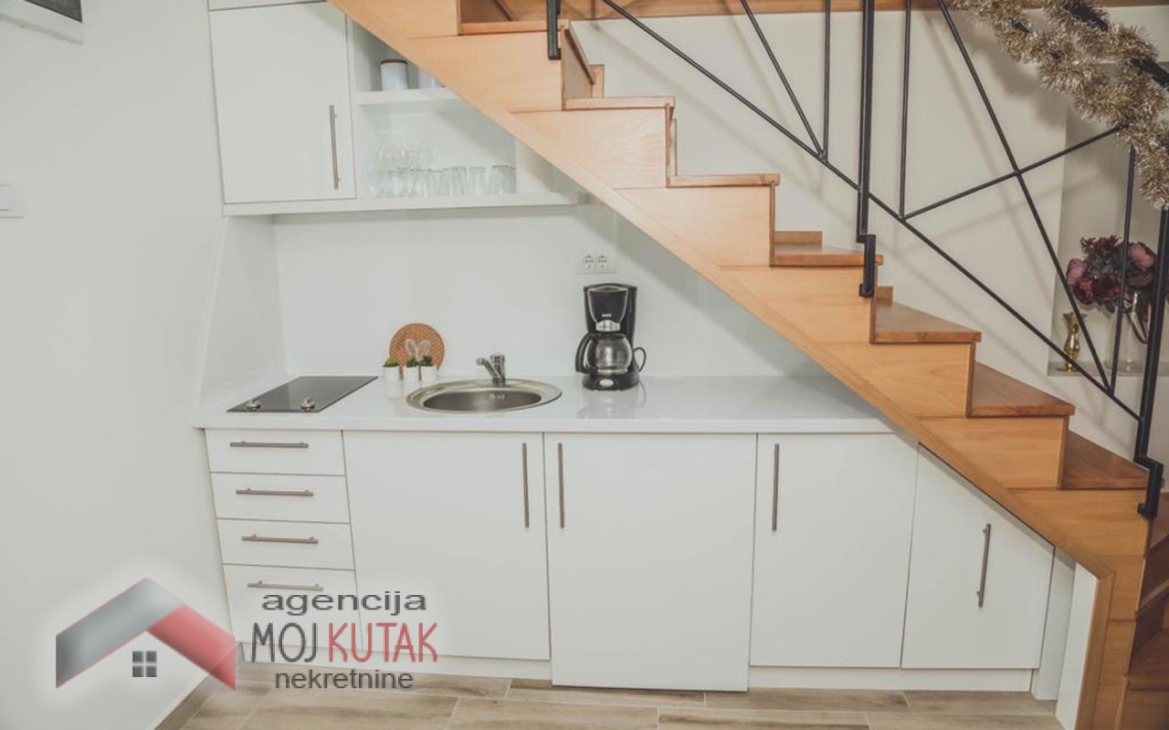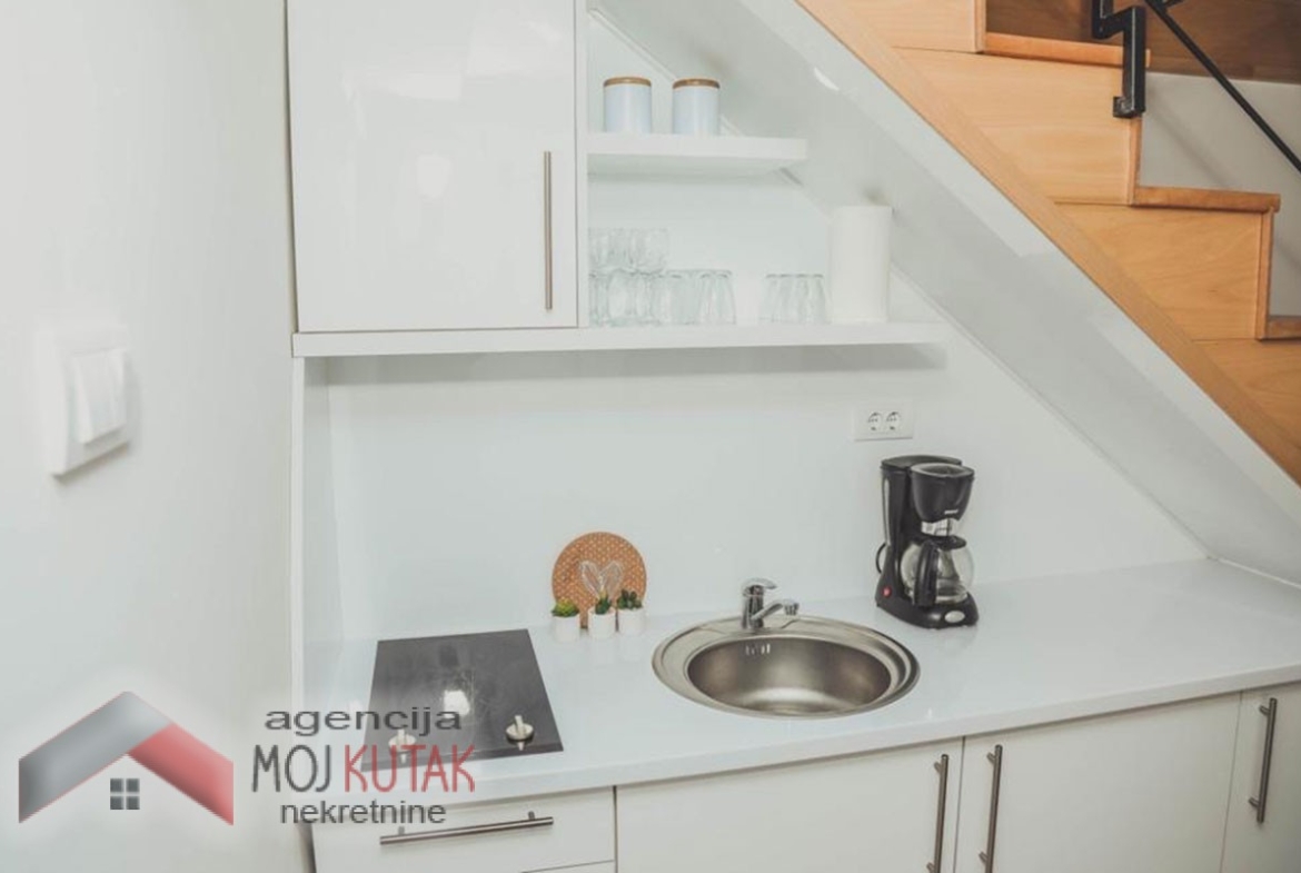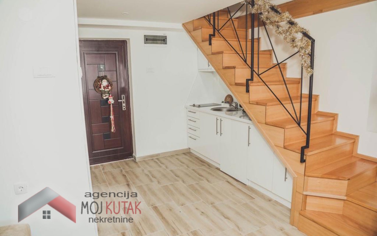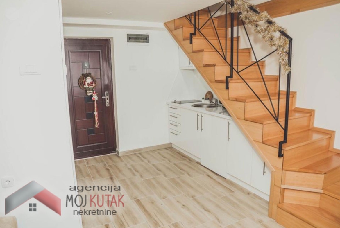 Površina stana je 50m2, dupleks, na prizemnom nivou dnevni boravak, kuhinja, kupatilo i terasa, a na galeriji spavaća soba. Prodaje se namešten.
