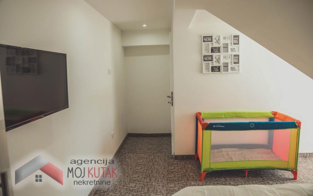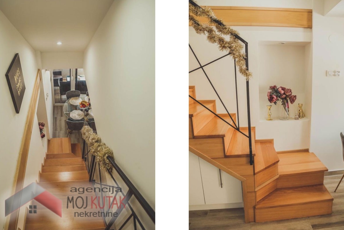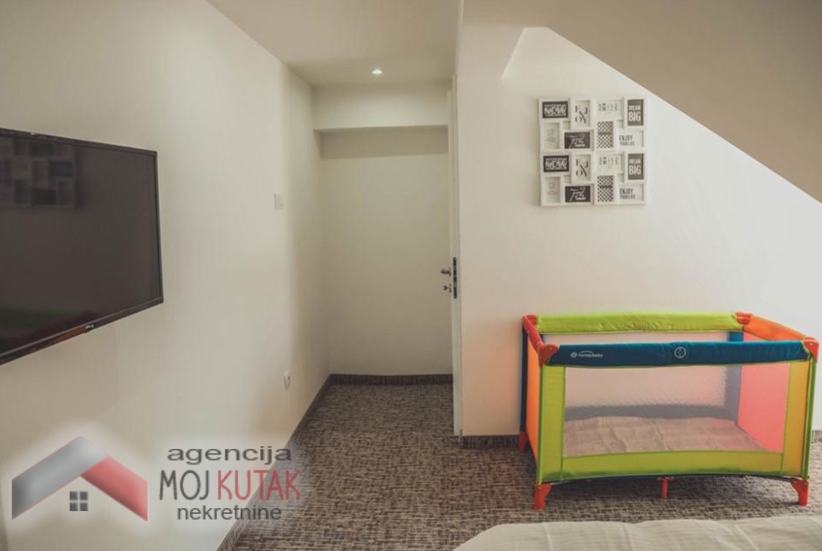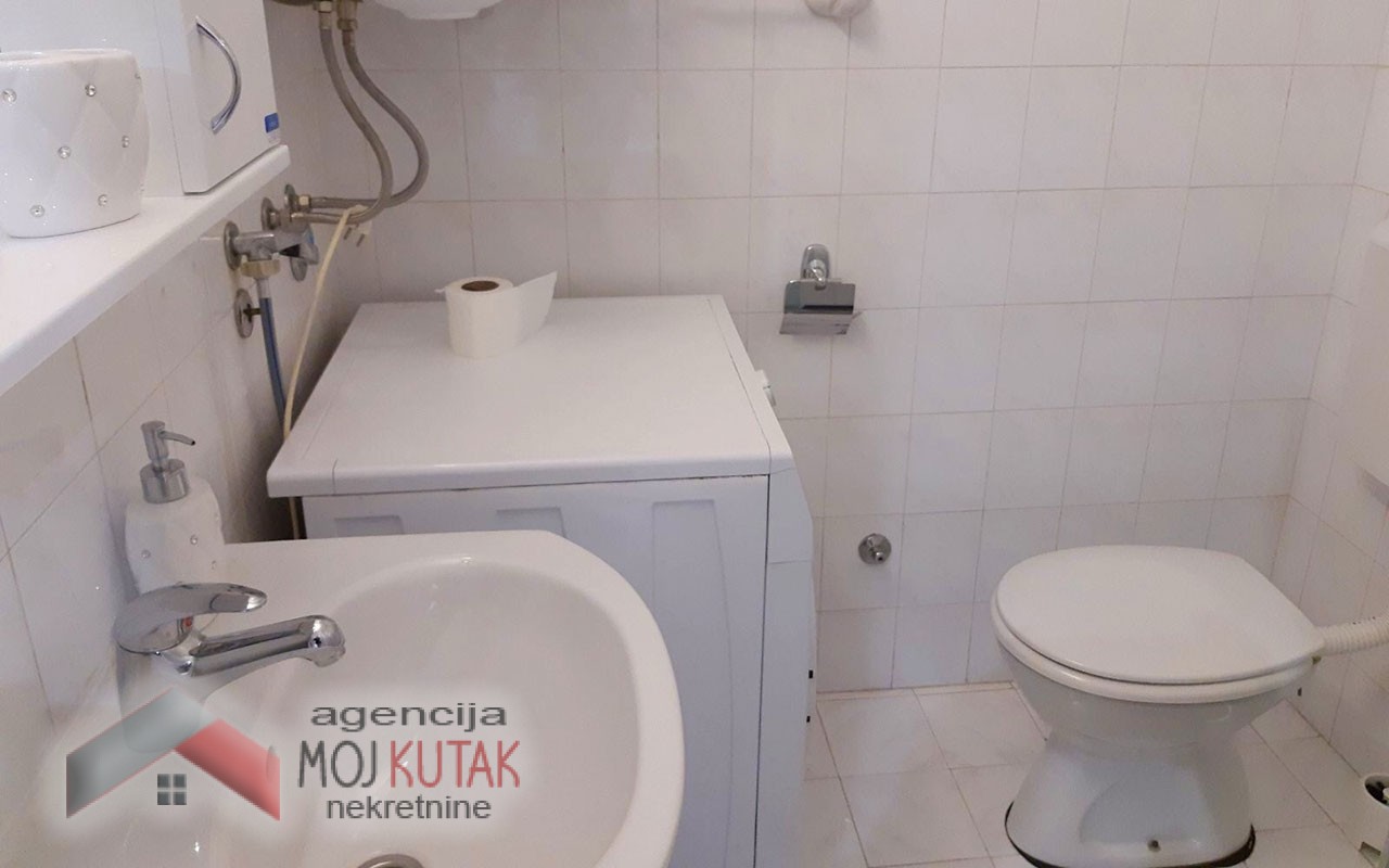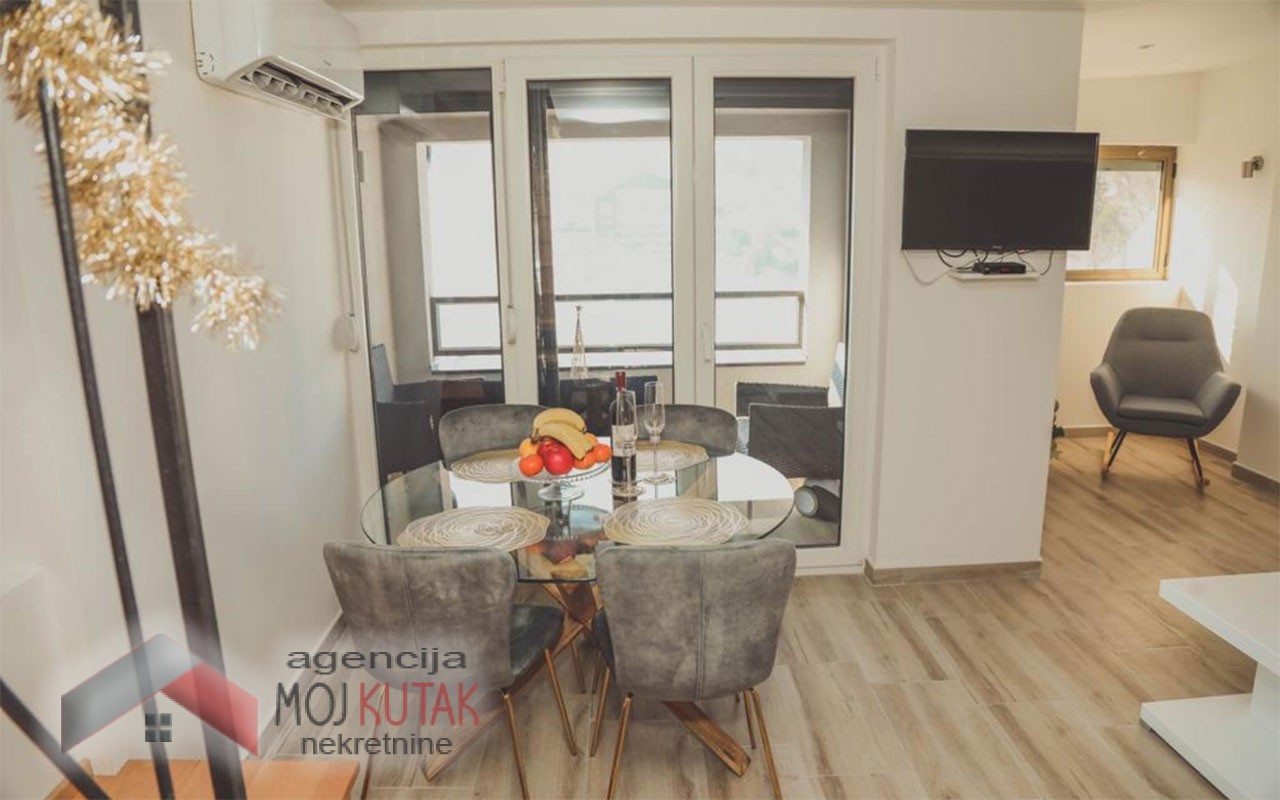 Površina stana je 50m2, dupleks, na prizemnom nivou dnevni boravak, kuhinja, kupatilo i terasa, a na galeriji spavaća soba. Prodaje se namešten.